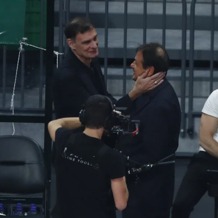 Εργκίν Αταμάν και Γιώργος Μπαρτ΄ζώκας είχαν ένα θερμό στιγμιότυπο πριν το τζάμπολ της αναμέτρησης ανάμεσα σε Παναθηναϊκό και Ολυμπιακό.