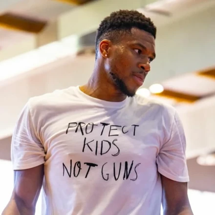 Ο Γιάννης Αντετοκούνμπο φορούσε ένα μπλουζάκι με ισχυρό αντιπολεμικό μήνυμα. Στις φωτογραφίες που ανέβασε ο 30χρονος παίκτης στα κοινωνικά δίκτυα φαίνεται ότι το T-shirt που φοράει γράφει «Προστατεύστε παιδιά, όχι όπλα».