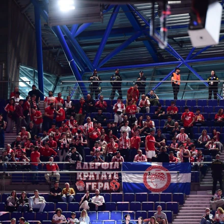 «Φέρτε μας το ευρωπαϊκό» τραγουδούσε ρυθμικά η κερκίδα στην οποία βρίσκονται οι φίλοι του Ολυμπιακού, αποθεώνοντας τους αθλητές της ομάδας κατά την είσοδό τους.