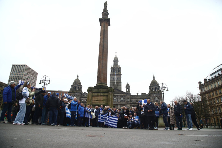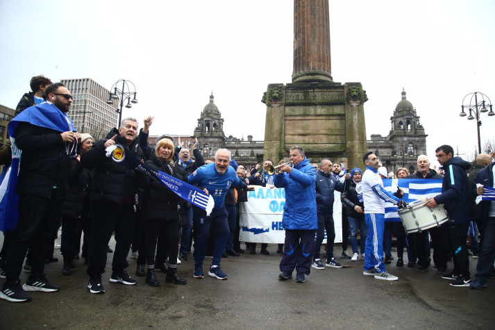 Η παρουσία των Ελλήνων φιλάθλων στην πόλη της Γλασκώβης αποτελεί ένα σημαντικό κεφάλαιο αυτής της προσπάθειας. Από νωρίς το πρωί της Κυριακής (23/3), εκατοντάδες υποστηρικτές της «γαλανόλευκης» –ανάμεσά τους και μέλη του γνωστού συνδέσμου φιλάθλων «Γαλανόλευκος Φάρος»– κατέκλυσαν την κεντρική πλατεία της πόλης. Με ελληνικές σημαίες στα χέρια, τραγούδια και συνθήματα, δημιούργησαν μια γιορτινή ατμόσφαιρα που δεν πέρασε απαρατήρητη από τους κατοίκους και επισκέπτες της σκωτσέζικης μεγαλούπολης.