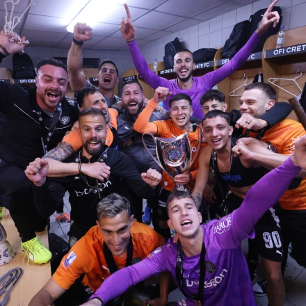 Οι παίκτες του ΟΦΗ στα αποδυτήρια πανηγυρίζουν μαζί με το Κύπελλο Ελλάδας/ Intime