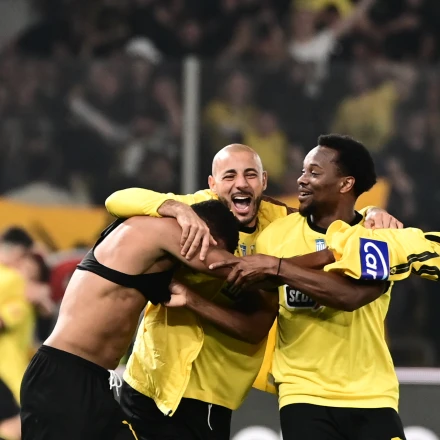 Νίκλας Ελίασον, Νορντίν Άμραμπατ και Λιβάι Γκαρσία πανηγυρίζουν γκολ της ΑΕΚ / Πηγή: Eurokinissi