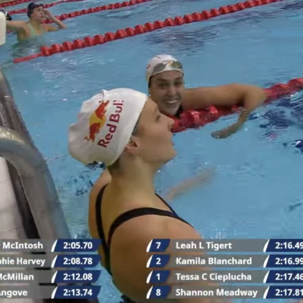 Η Καναδή κολυμβήτρια κατέρριψε το παγκόσμιο ρεκόρ στα 200 μέτρα μεικτή με χρόνο 2:05.70 στους προκριματικούς αγώνες της χώρας της για το Παγκόσμιο Πρωτάθλημα της Σιγκαπούρης.