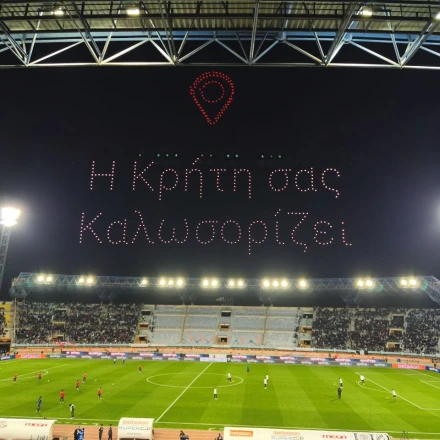 Μάλιστα, μερικά λεπτά προτού αρχίσει το δεύτερο ημίχρονο, η ΕΠΟ είχε φροντίσει να διοργανώσει ένα φαντασμαγορικό drone show. Συγκεκριμένα, drone ανέβηκαν ψηλά στον ουρανό του σταδίου και σχημάτισαν διάφορες φιγούρες, το σήμα της Περιφέρειας Κρήτης, ενώ έπειτα ακολούθησε και το «ερυθρόλευκο» λιοντάρι.
