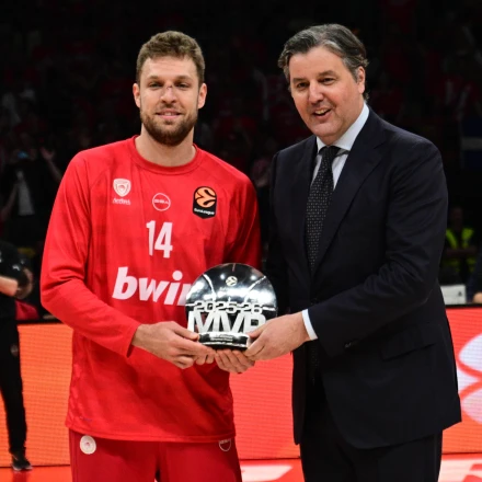 Ο Πρόεδρος της Euroleague Ντέγιαν Μποντίρογκα βράβευσε τον MVP Σάσα Βεζένκοφ πριν το game 2 των playoffs του Ολυμπιακού με τη Μονακό.