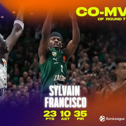Ο Τσίμα Μονέκε του Ερυθρού Αστέρα και ο Σιλβέν Φρανσίσκο της Ζαλγκίρις μοιράστηκαν το βραβείο του MVP της έβδομης αγωνιστικής της EuroLeague. Είναι η πρώτη φορά τη φετινή σεζόν που αναδεικνύονται δύο παίκτες πολυτιμότεροι της αγωνιστικής.