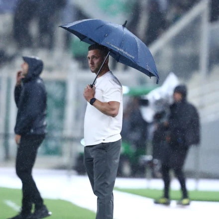 Ο προπονητής της Γκόου Αχέντ Ινγκλς Μέλβιν Μπόελ έδινε οδηγίες όρθιος κρατώντας μία ομπρέλα λόγω της έντονης βροχόπτωσης στο ΟΑΚΑ.
