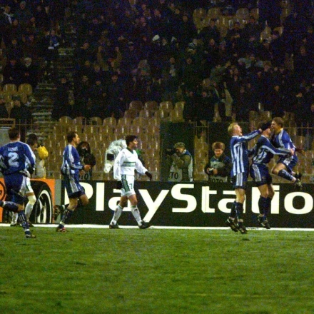 Αρχικά, στις 16 Σεπτεμβρίου του 1998, ο Παναθηναϊκός θα υποδεχτεί στο γήπεδο της ΑΕΚ στην Νέα Φιλαδέλφεια την Δυναμό Κιέβου, θα επικρατήσει με 2-1 χάρις σε τέρματα των Μίκλαντ και Λυμπερόπουλου, κάνοντας ανατροπή, μετά το 0-1 του πρώτου ημιχρόνου, με τον Ρεμπρόφ να έχει ανοίξει το σκορ για τους φιλοξενούμενους. Ειρήσθω εν παρόδω, εκείνη η αναμέτρηση είχε διεξαχθεί στο «Νίκος Γκούμας», γιατί στο ΟΑΚΑ είχε γίνει μεγαλειώδης συναυλία των «Rolling Stones».