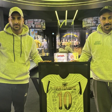 Ο Κωνσταντίνος και ο Τριαντάφυλλος Παντελίδης με την φανέλα στο Μουσείο της ΑΕΚ / Screenshot