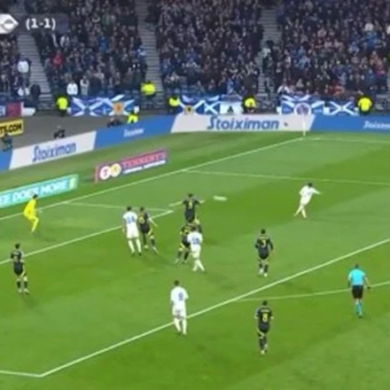 Το γκολ του Καρέτσα καταγεγραμμένο από κάμερα πίσω από την εστία του γκολκίπερ της Σκωτίας, Γκόρντον.